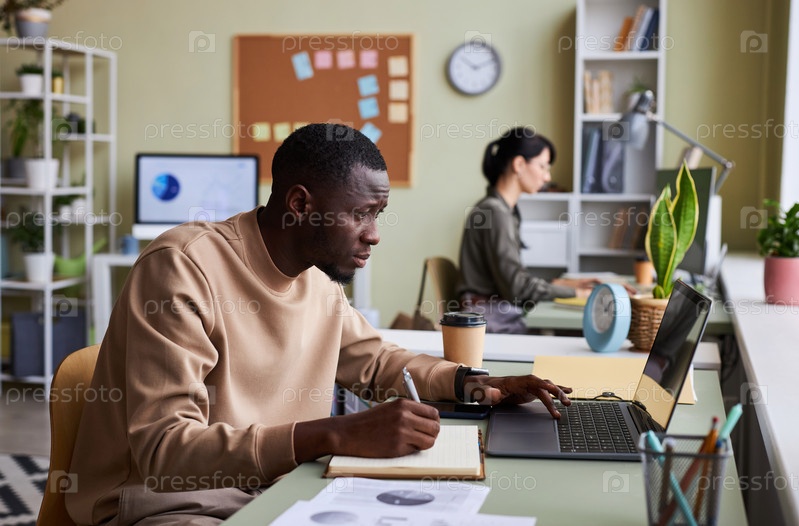 Чернокожий молодой человек, работающий за столом в офисе и записывающийся в блокноте