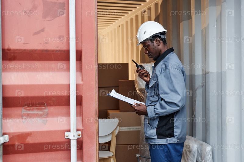 Работник-мужчина, проверяющий контейнеры в судоходном доке