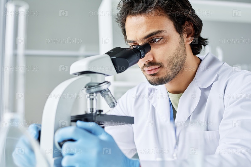 Молодой серьезный вирусолог в лабораторном пальто изучает новые бактерии в лаборатории