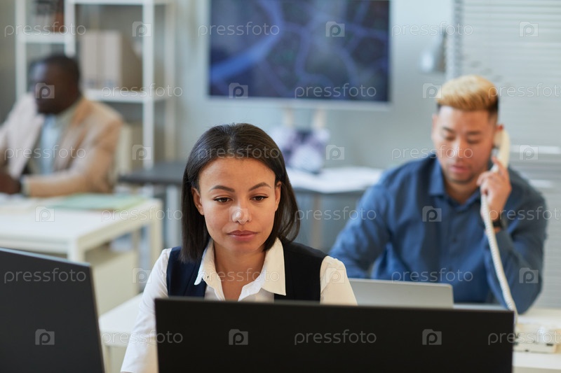 Молодая чернокожая женщина смотрит на компьютерный экран в офисе мониторинга