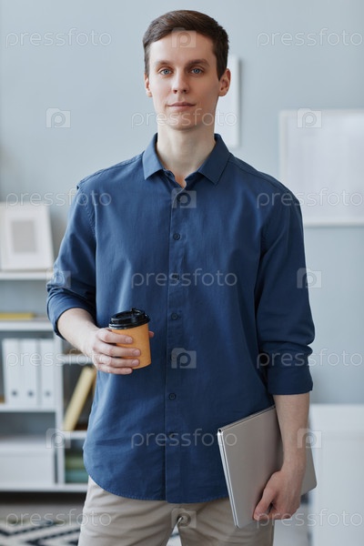 Молодой бизнесмен смотрит на камеру, стоя у рабочего места