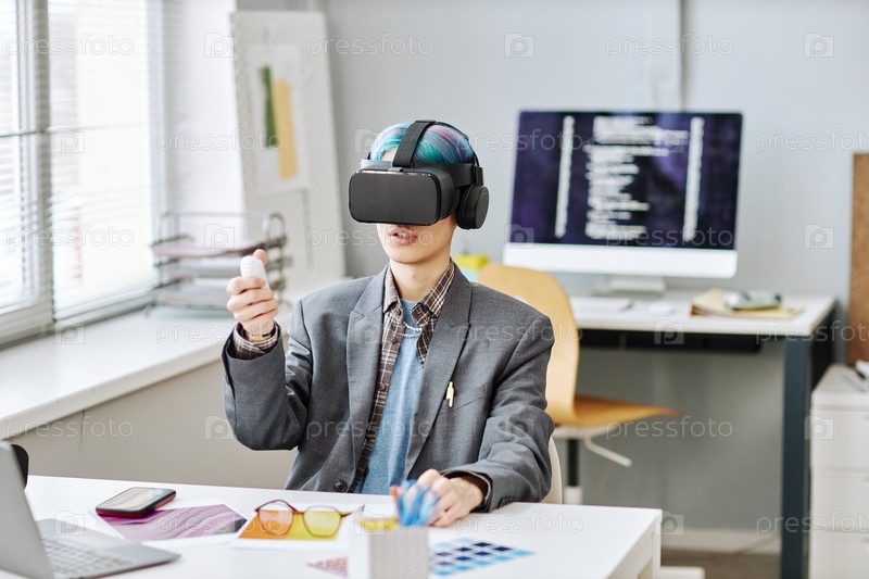 Молодой человек, носящий гарнитуру VR в офисе, работает над проектом иммерсивной реальности