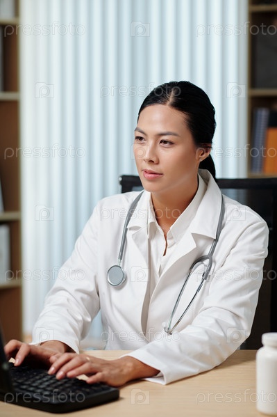 Молодая самоуверенная женщина теледок в лабораторном пальто, печатающая на компьютерной клавиатуре