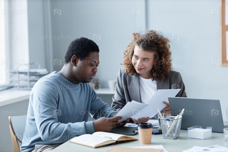 Молодой афроамериканский мужской брокер и его коллега-женщина обсуждают