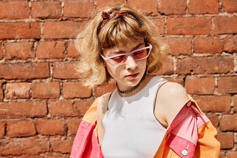 Женщина, одетая в уличный стиль моды на открытом воздухе против кирпичной стены