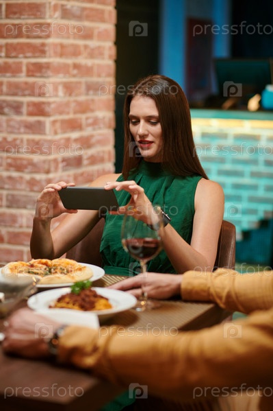 Женщина фотографирует еду в ресторане