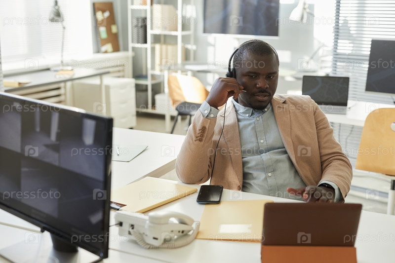 Чернокожий мужчина говорит через гарнитуру в колл-центре
