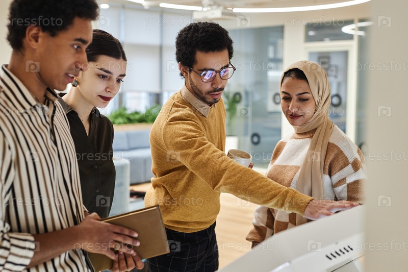 Группа молодых арабских профессионалов, использующих цифровой экран в офисе