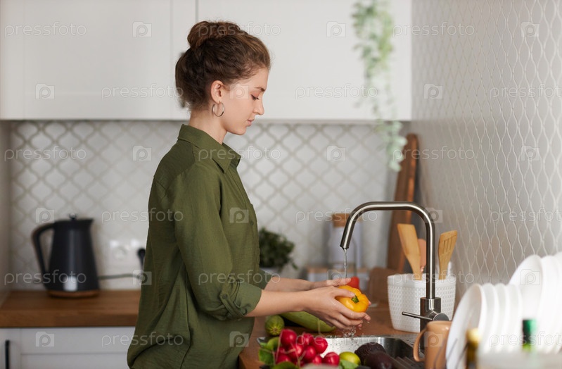 Боковой вид женщина, стирающая свежие овощи на кухне