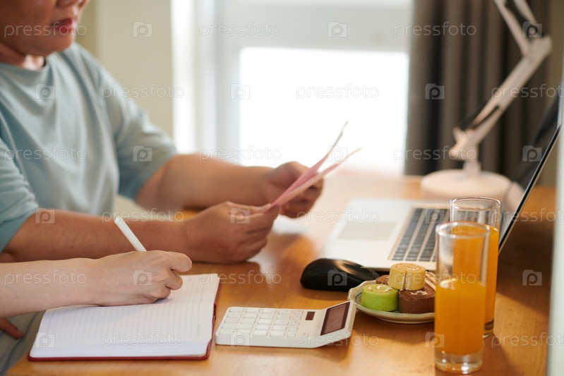 Мальчик помогает бабушке платить счета онлайн