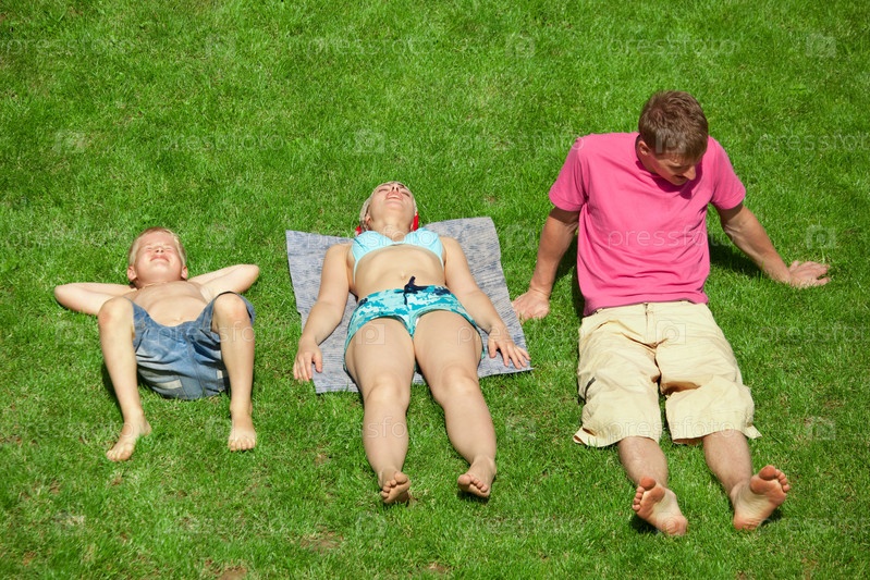 Семья загорает на лужайке