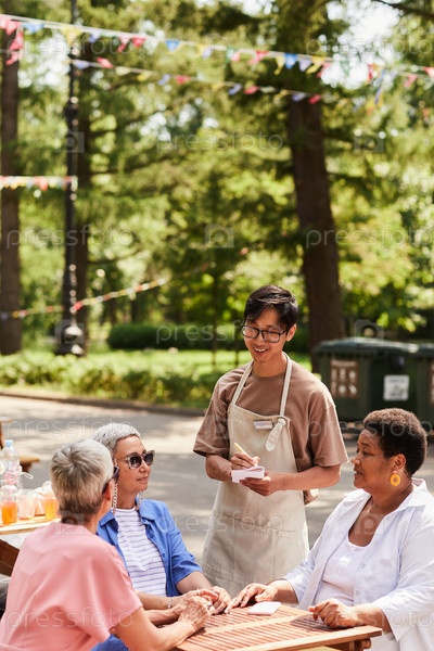 Вертикальный улыбающийся молодой официант обслуживает группу пожилых женщин в открытом кафе