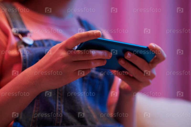 Девушка играет в видеоигру на смартфоне