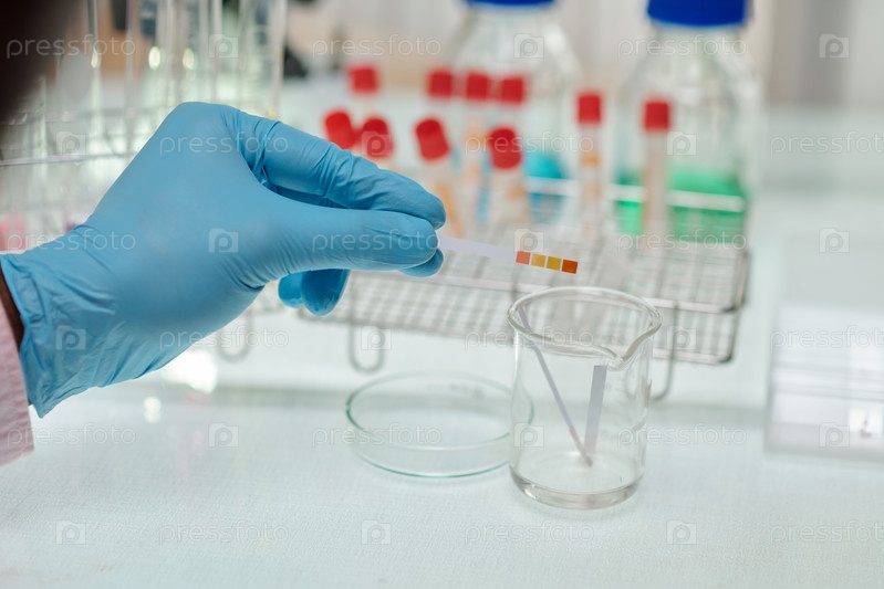 Перчатковая рука химика, держащего индикатор pH-кислоты над стеклянной посудой