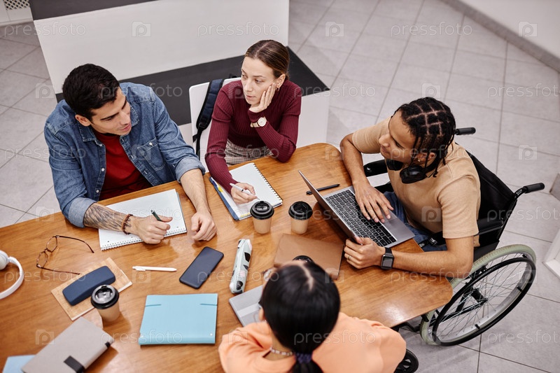 Разнообразная группа молодых людей, изучающих вместе в библиотеке колледжа