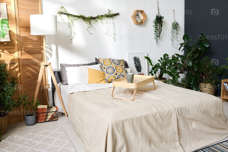 Современная уютная спальня с кроватью