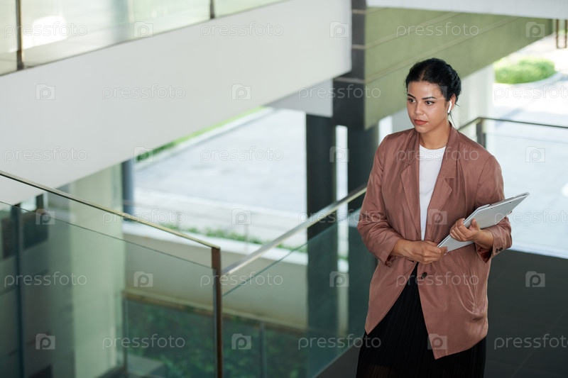 Деловая женщина несет документ на верхний этаж