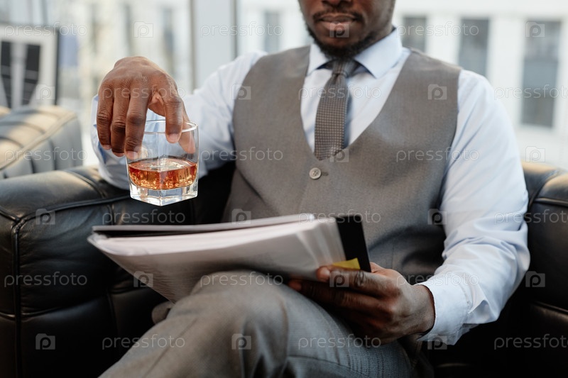 Ближайшее изображение успешного чернокожего бизнесмена, пьющего виски в офисе