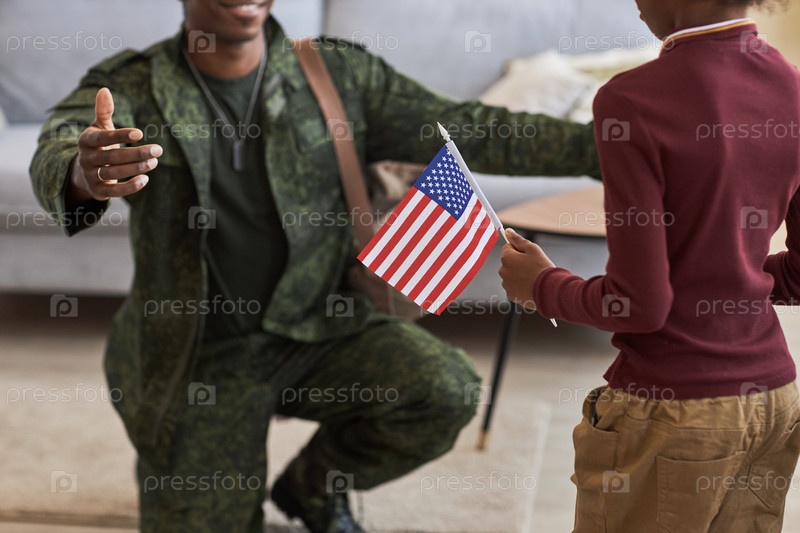 Девушка с американским флагом встречается со своим отцом