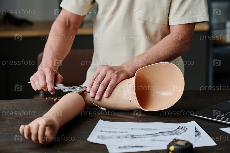 Близкий снимок старшего мужчины, строящего протезы рук с тщательным измерением деталей