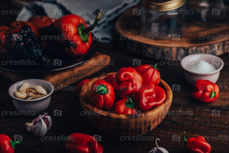 Красный перец хабанеро, обугленные помидоры и болгарский перец для острого соуса чили