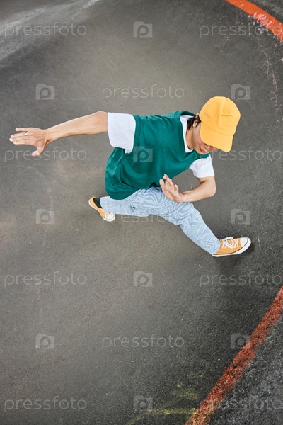 Молодой человек танцует на свежем воздухе и одет в красочную уличную одежду