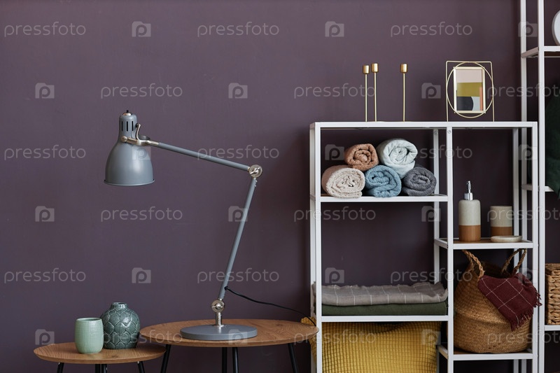 Лампа и две маленькие вазы, стоящие на круглых столах у стены