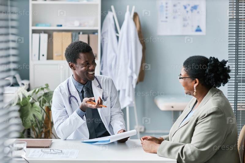 Улыбающийся чернокожий врач разговаривает с женщиной во время консультации в клинике