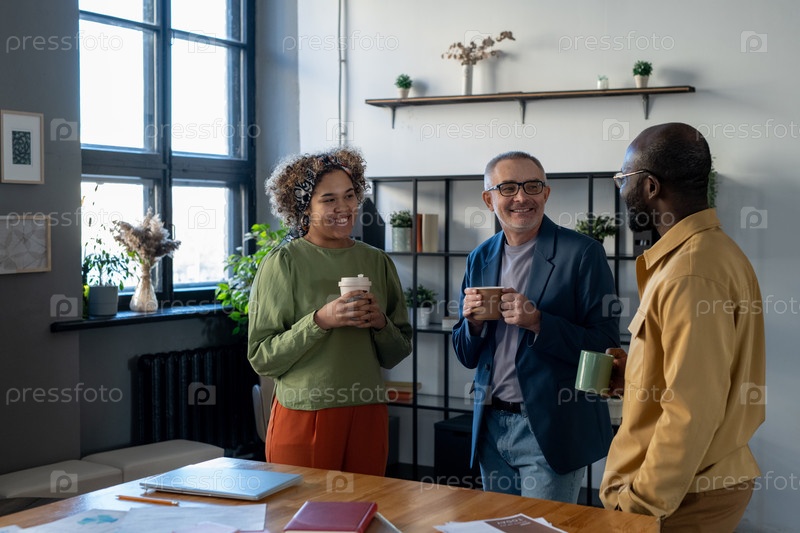 Три успешных коллеги в умной повседневной одежде выпивают на перерыве