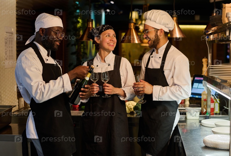 Группа счастливых молодых сотрудников межкультурной кухни, празднующих открытие нового кафе