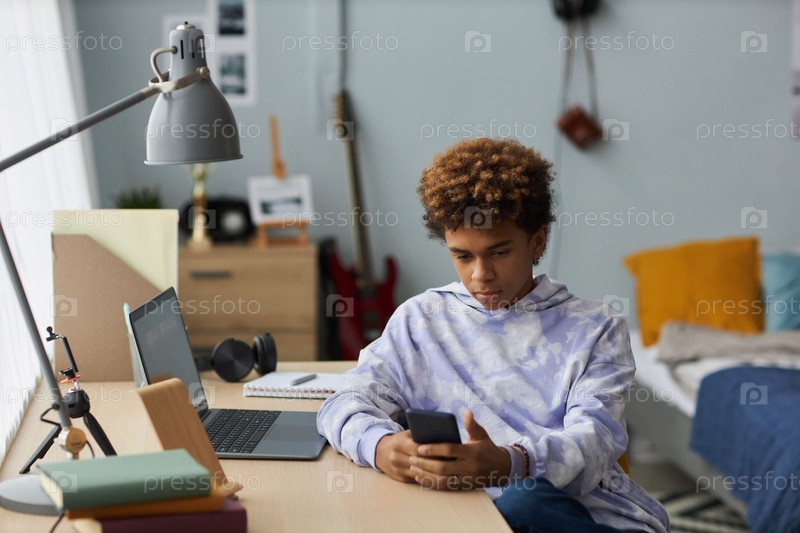Молодой серьезный парень в повседневной одежде отправляет сообщения по мобильному телефону