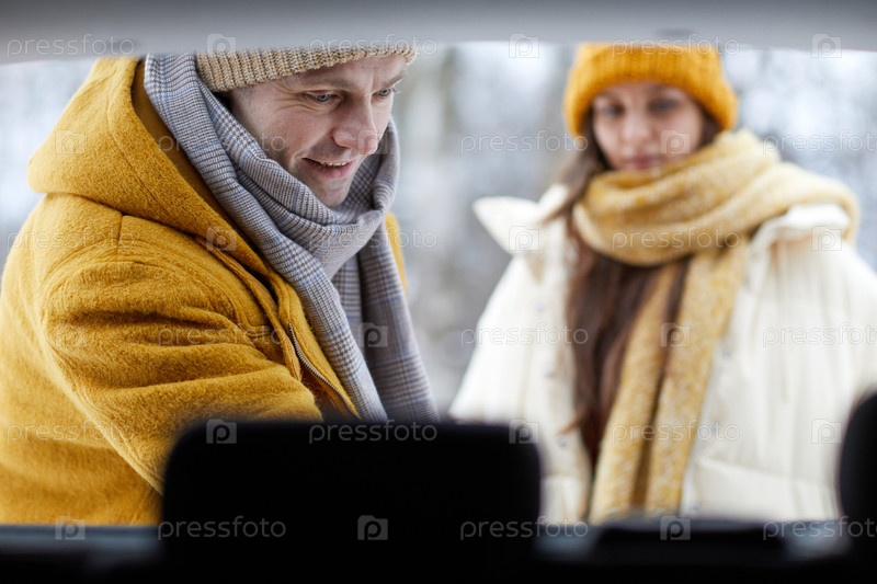 Человек, разгружающий багажник автомобиля зимой