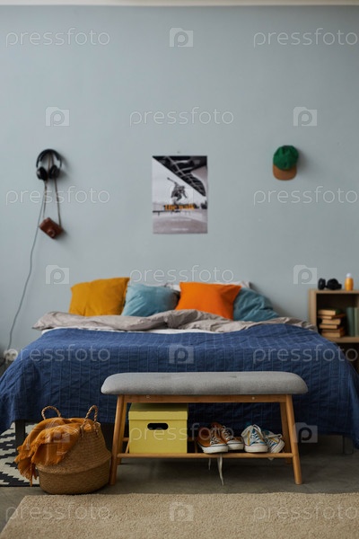 Двухместная кровать с группой многоцветных подушек, стоящих на серой стене