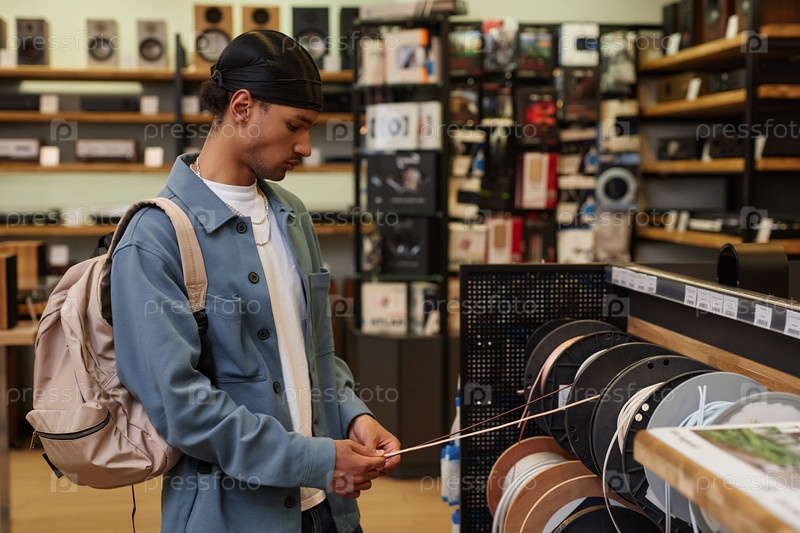 Боковой вид черный молодой человек, выбирающий провода и шнуры для музыкального оборудования в магазине