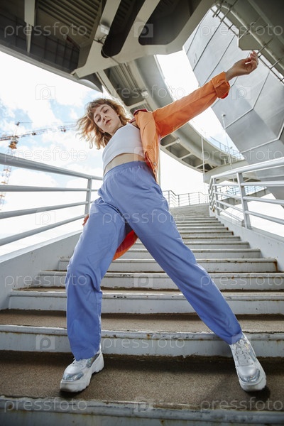 Динамический полнометражный снимок молодой женщины, танцующей на свежем воздухе