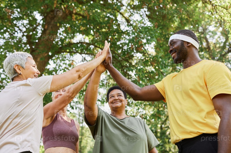 Старшие женщины с мужским тренером после того, как насладились тренировкой на свежем воздухе