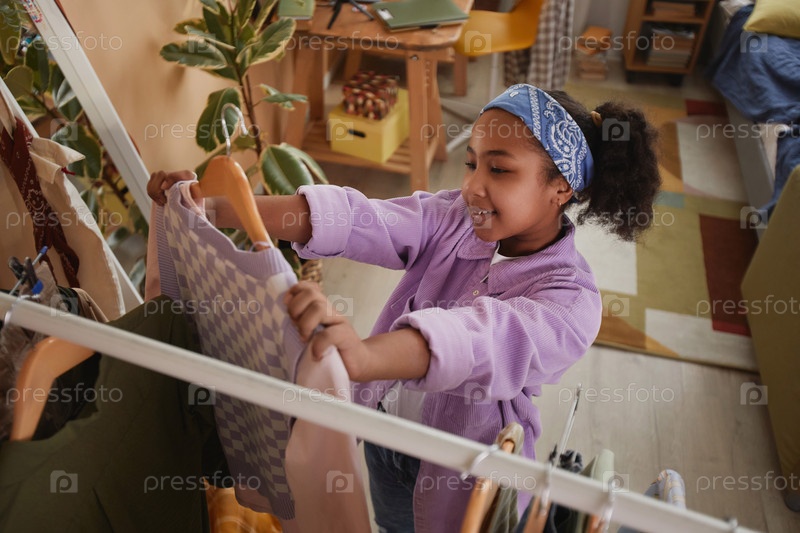 Чернокожая девочка-подросток пытается надеть одежду в зеркале в комнате