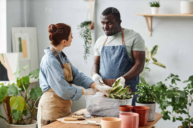 Мультиэтническая пара пересаживает экзотическое змеиное растение вместе в уютной обстановке