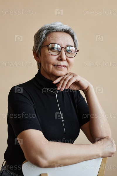 Азиатская старшая женщина смотрит на камеру, опираясь на стул