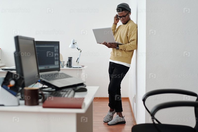 Молодой серьезный афроамериканский программист-мужчина с ноутбуком, стоящим у стены