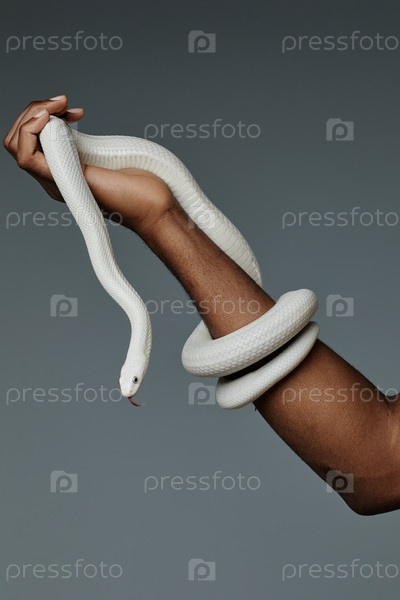 Часть руки молодого человека, держащего белую змею в запястье