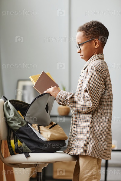 Американский мальчик упаковывает рюкзак African American Boy Packing Backpack Side View