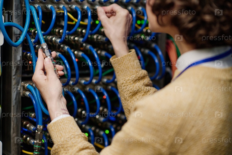 Инженерка-женщина соединяет провода в серверном шкафу