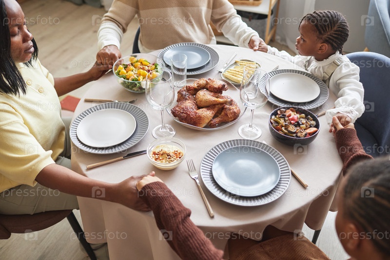 Семья из четырех человек молится перед ужином
