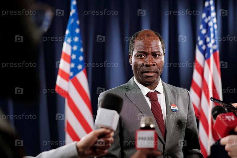 Зрелый мужчина-депутат смотрит на одного из журналистов во время интервью