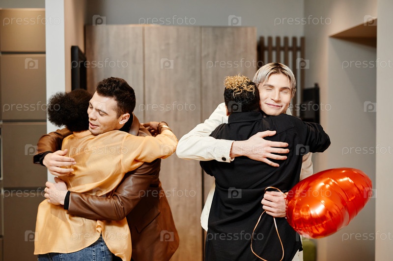 Две счастливые молодые гомосексуальные пары приветствуют друг друга, обнимаясь