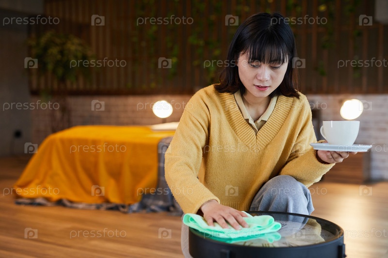 Молодая женщина убирает пыль дома