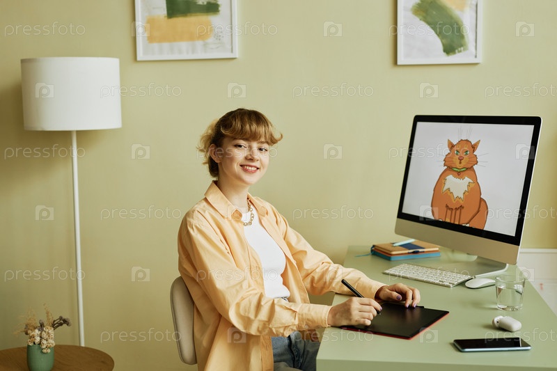 Молодая успешная блондинка со стилусом и графическим планшетом