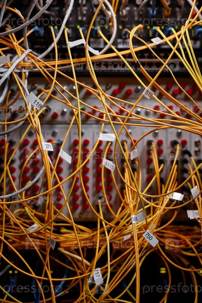 Фональный серверный шкаф с желтыми интернет-кабелями