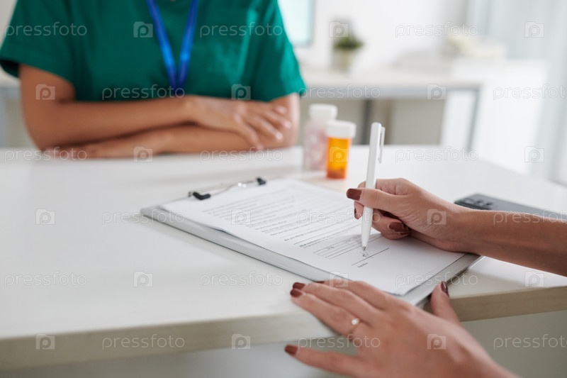 Женщина-пациент заполняет медицинскую форму
